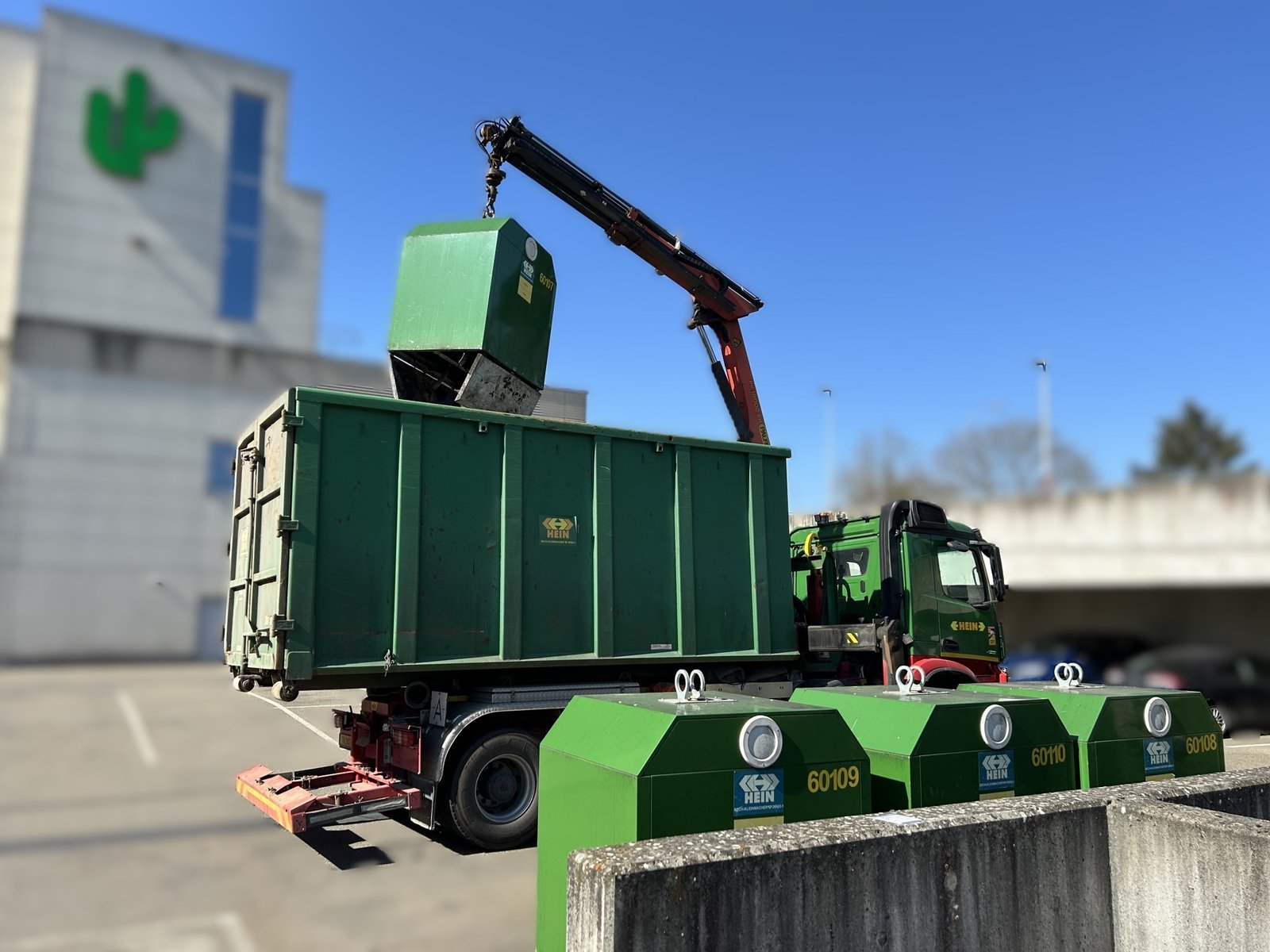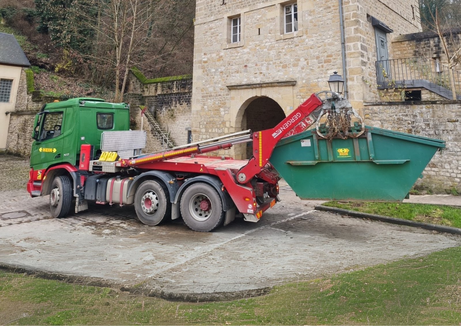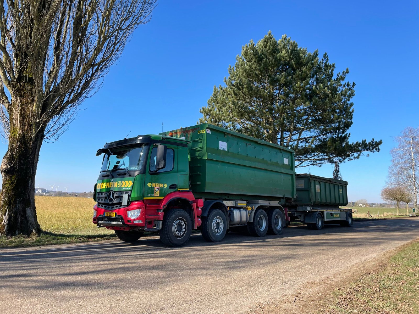 Ein LKW mit einem hydraulischen Arm, der Container aufnimmt und absetzt, ohne sie zu kippen. Häufig verwendet für Bauabfälle oder Schutt.